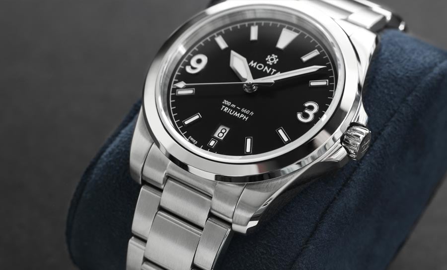 The Triumph’s 316L stainless steel case features a screw-down crown with protective guards and a sapphire caseback adorned with detailed engravings. Polished case sides and bezel add a refined contrast to its robust construction.