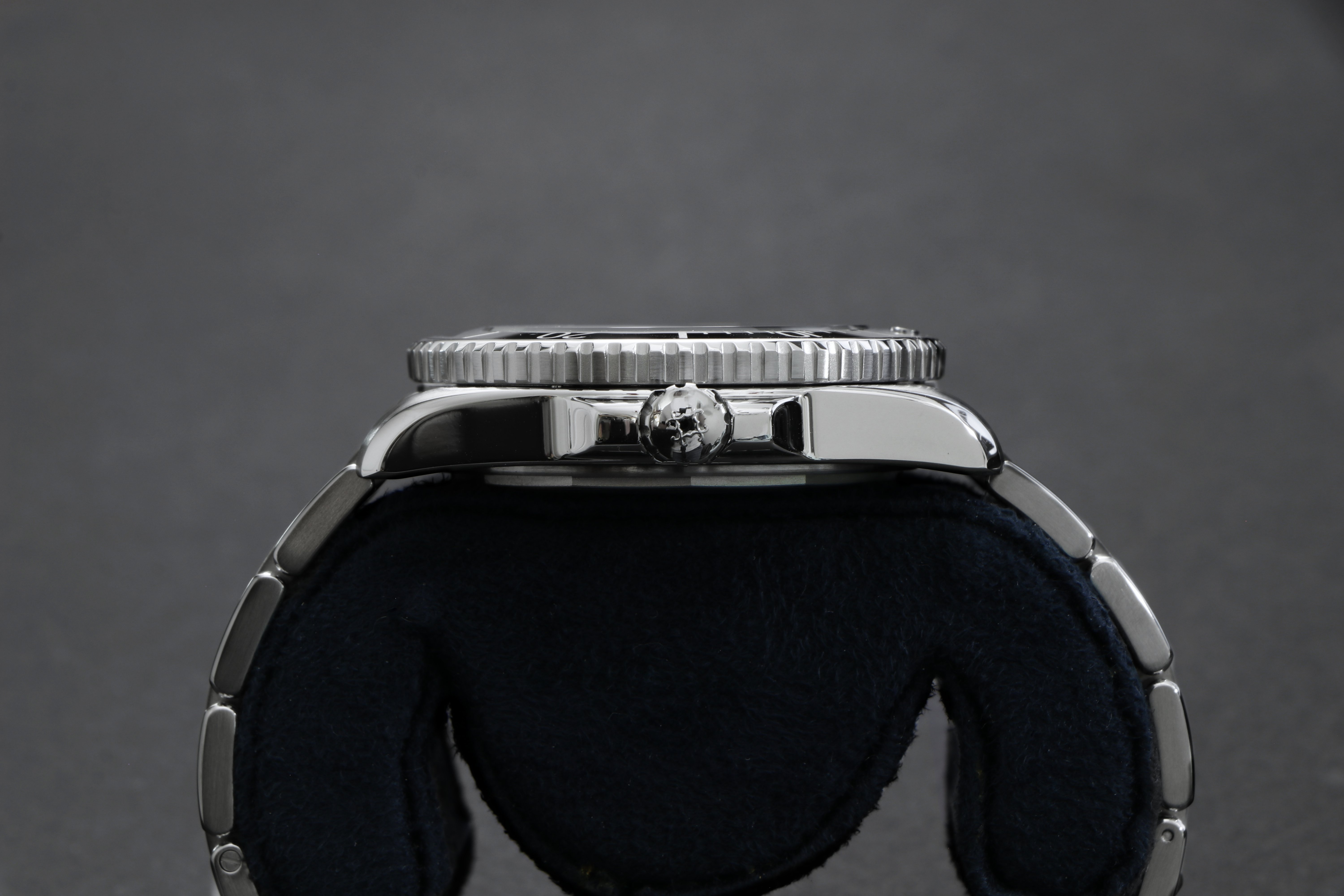 The Oceanking case is made of 316L stainless steel with a screw-down crown, guards, and solid caseback with engravings around the perimeter.  The mid-case features polished sides with bevels on the outer lugs.  The bezel uses a patent-pending assembly with 120 satisfying clicks.
