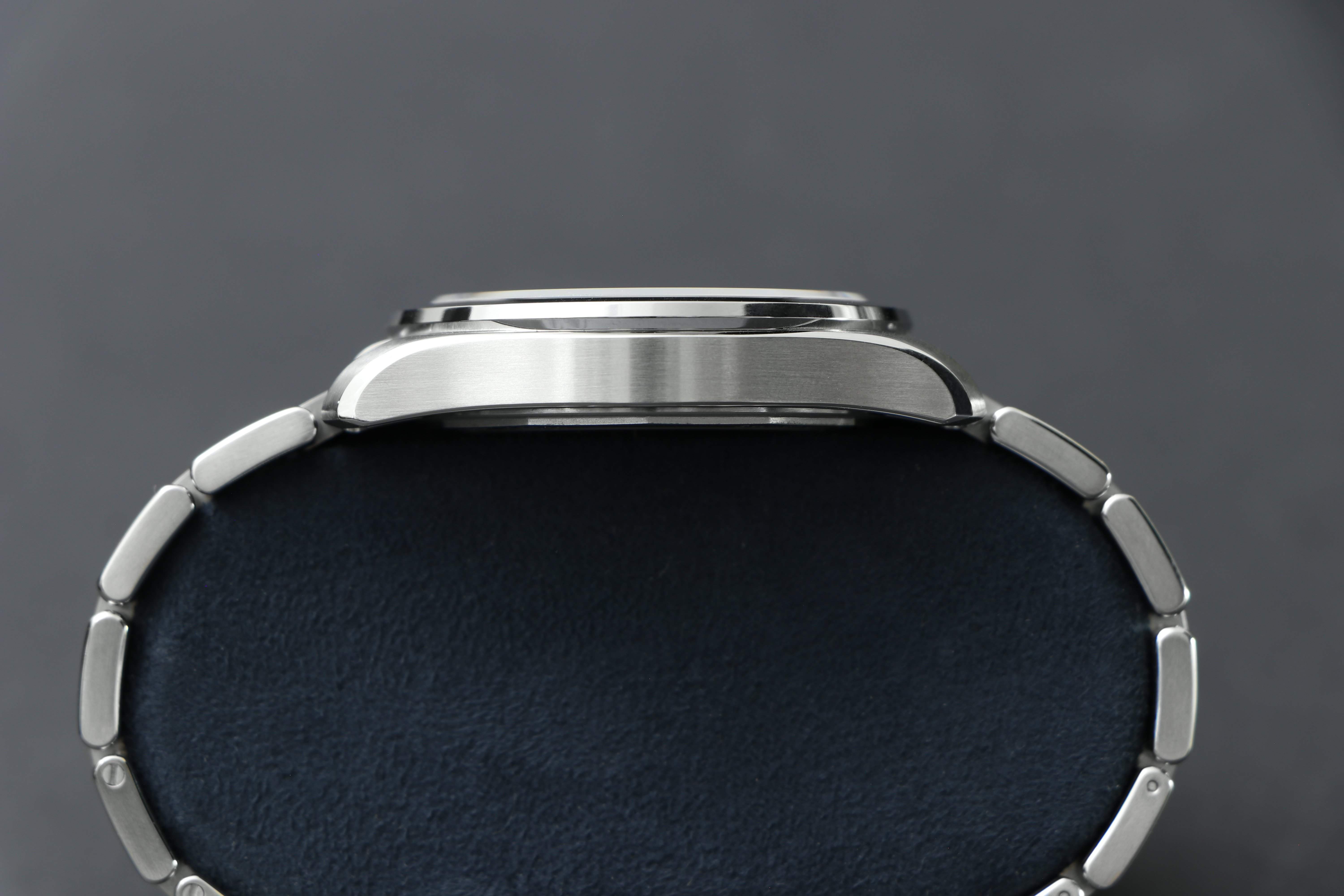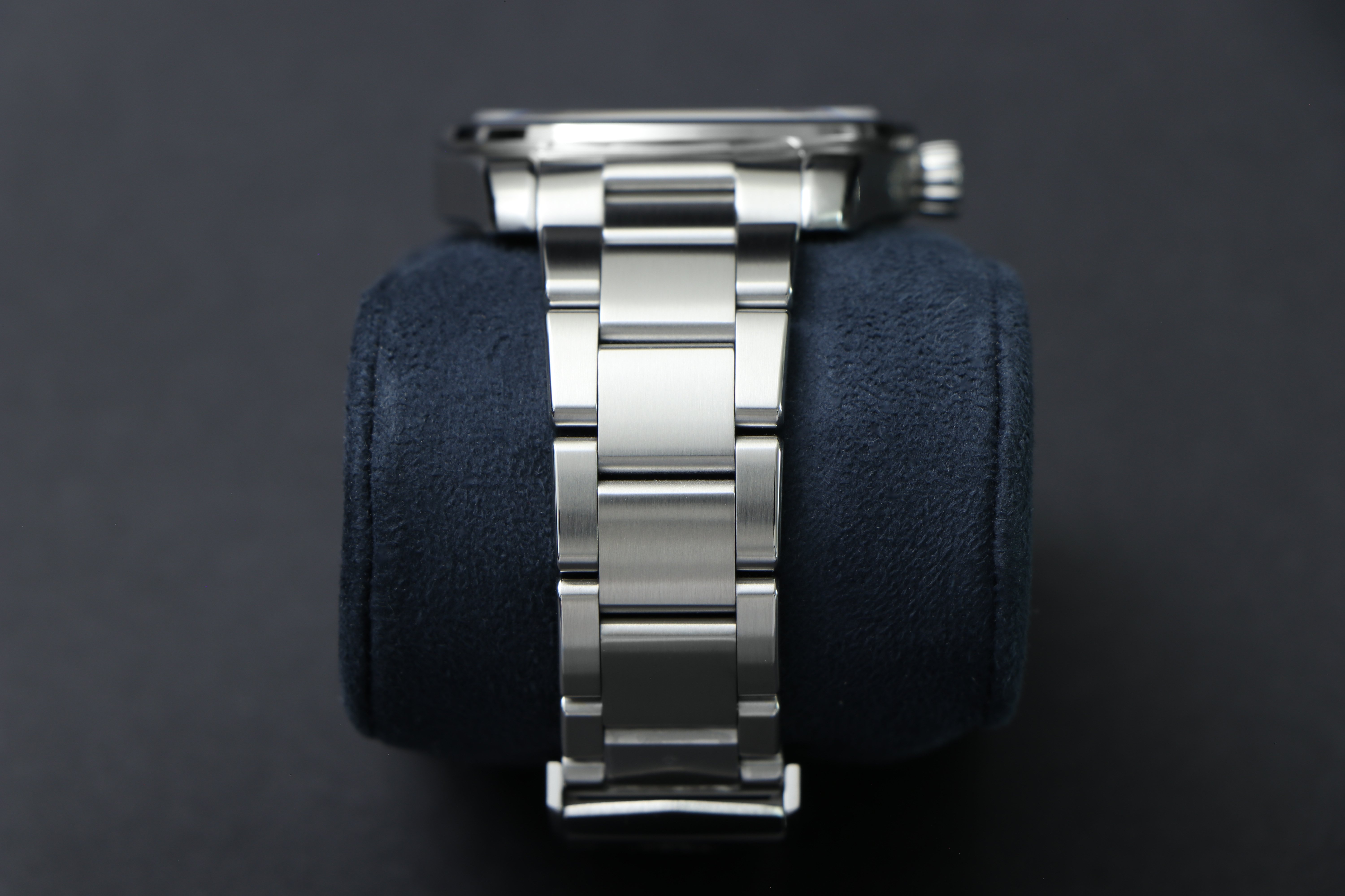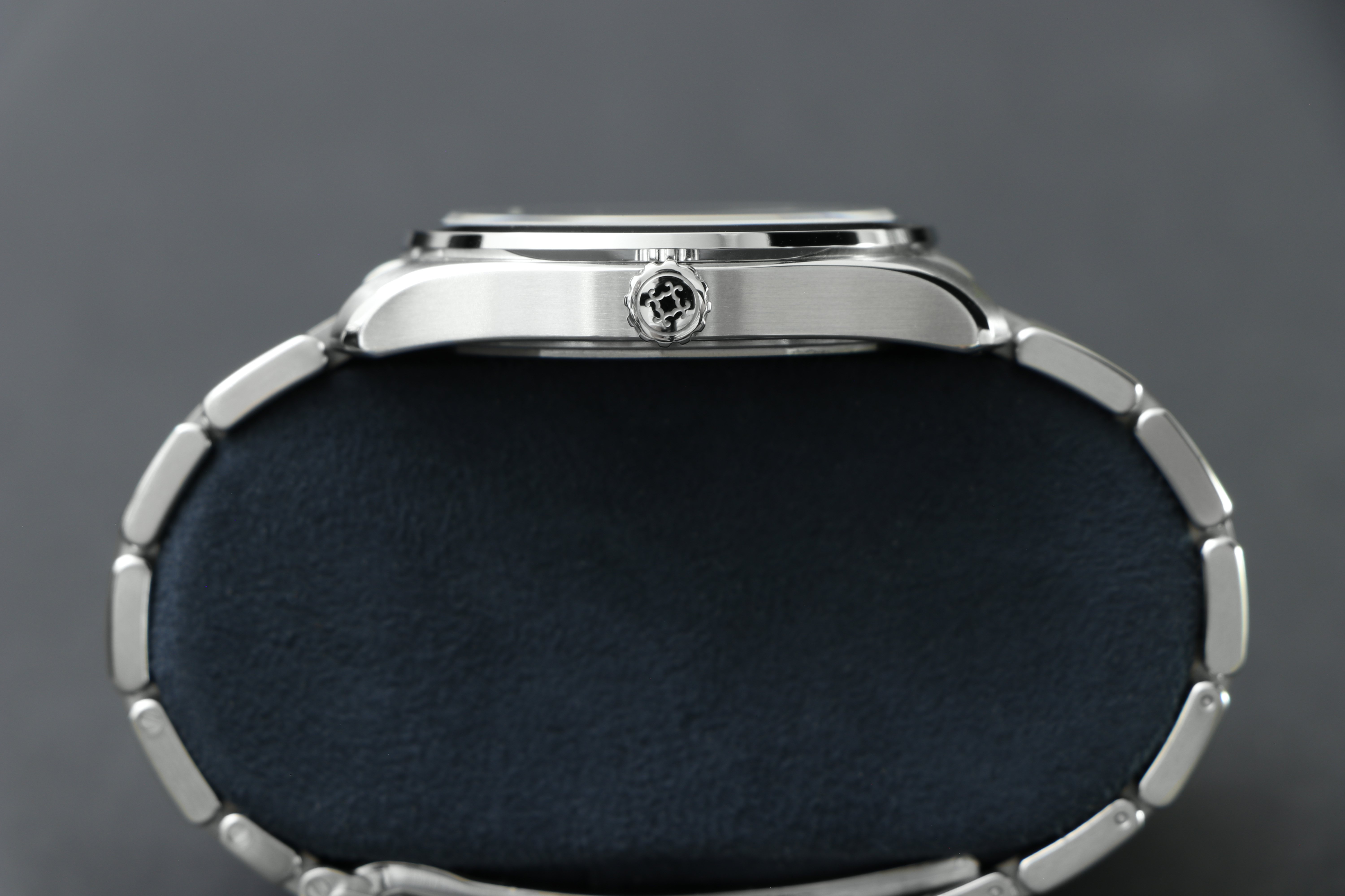 The Noble case is made of 316L stainless steel with a screw-down crown and sapphire caseback with engravings. The mid-case features brushed sides with polished bevels on the inner and outer lugs. The bezel is mirror polished.